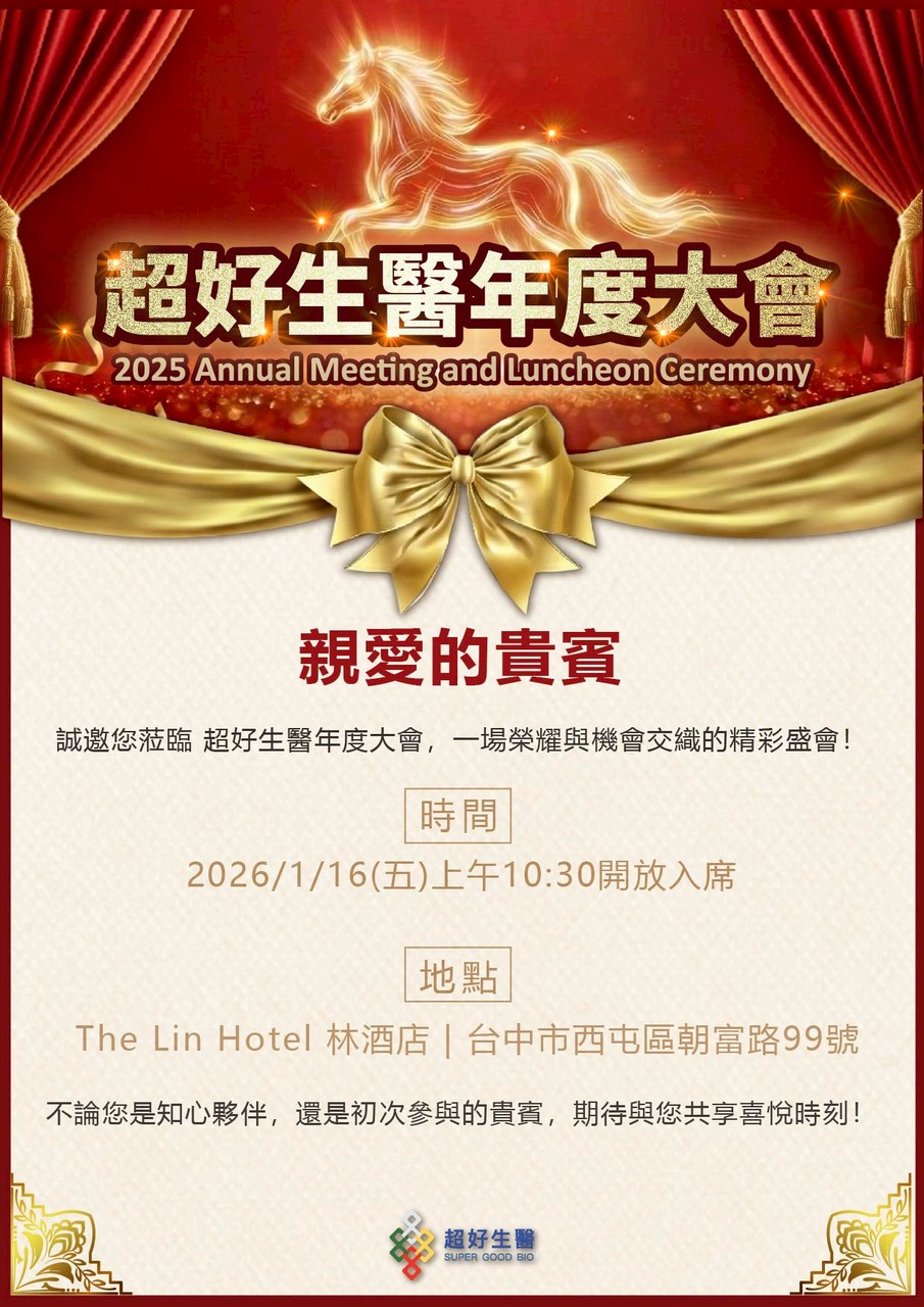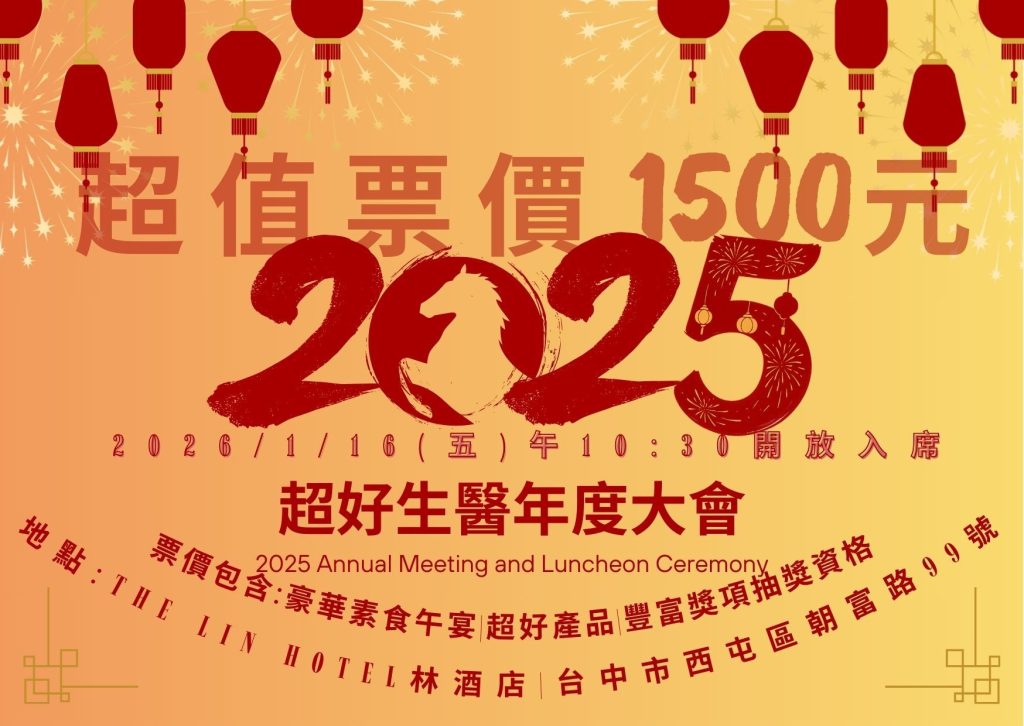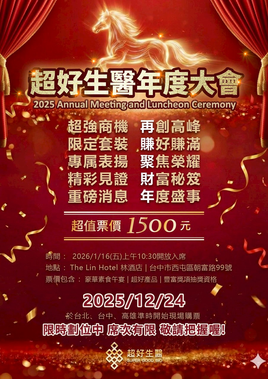 【馬年盛典】2025 超好生醫年會 學習小確幸超棒覺醒2D2026國際旅【馬年盛典】2025 超好生醫年會 【活動公告】2025 超好生醫年會:馬年盛典.領航未來 ♦ 活動日期:2026 年 1 月 16 日 (星期五)♦ 活動時間:10:30 開放入席♦ 活動地點:台中林酒店♦ 活動票價:1,500 元/人 (含豪華午宴、好禮、抽獎) 【活動流程搶先看】2025 精彩回顧: 銘記每一份感動與成就。重磅嘉賓演說: 掌握企業願景與佈局。新品首度發表: 搶占市場先機,再創事業高峰。產品與收入見證: 真實案例,傳遞健康與財富。千萬豪禮抽獎: 豐富大獎,回饋每一位夥伴。 2025年會獎勵公告我們將回顧過去一年的閃耀時刻,每一步都鑄就了我們今日的輝煌。我想看PPT全內容...