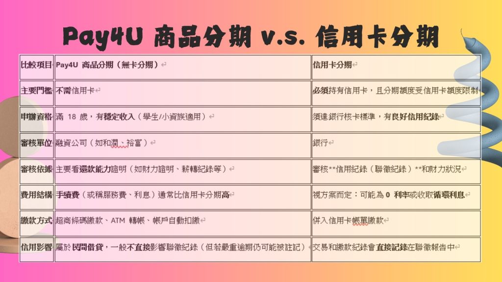 | 比較項目 | Pay4U 商品分期(無卡分期) | 信用卡分期 |