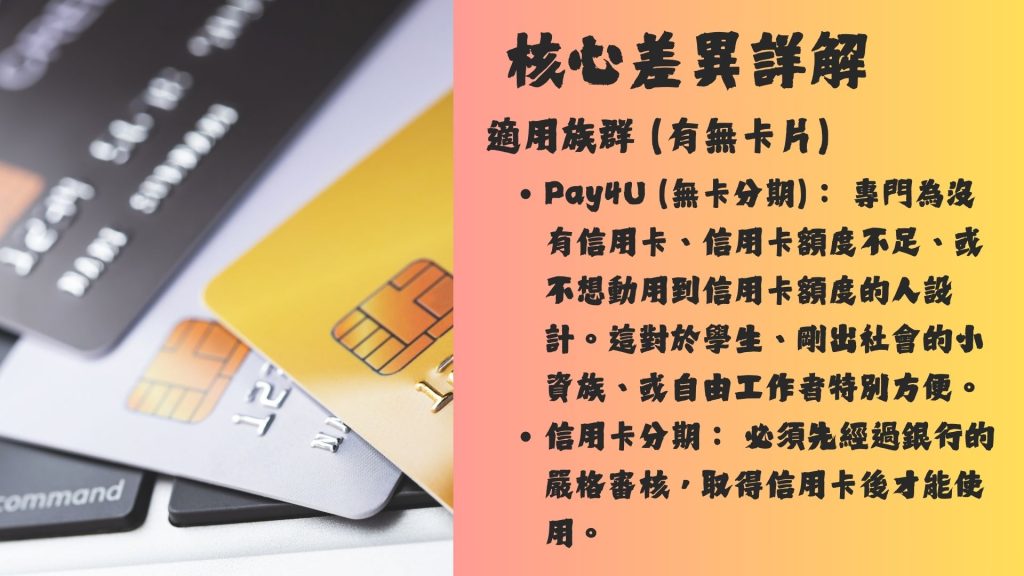 Pay4U 商品分期與信用卡分期最大的差異在於是否需要「信用卡」,以及審核標準和收費方式的不同。