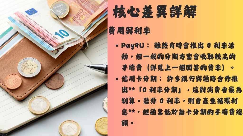 | 費用結構 | 手續費(或稱服務費、利息)通常比信用卡分期高 | 視方案而定:可能為0 利率或收取循環利息 |