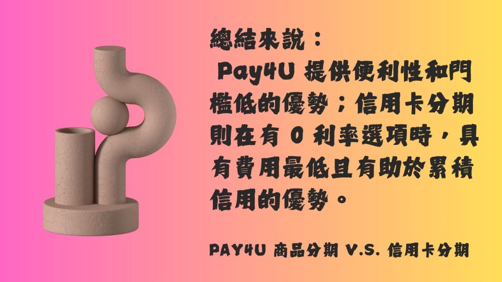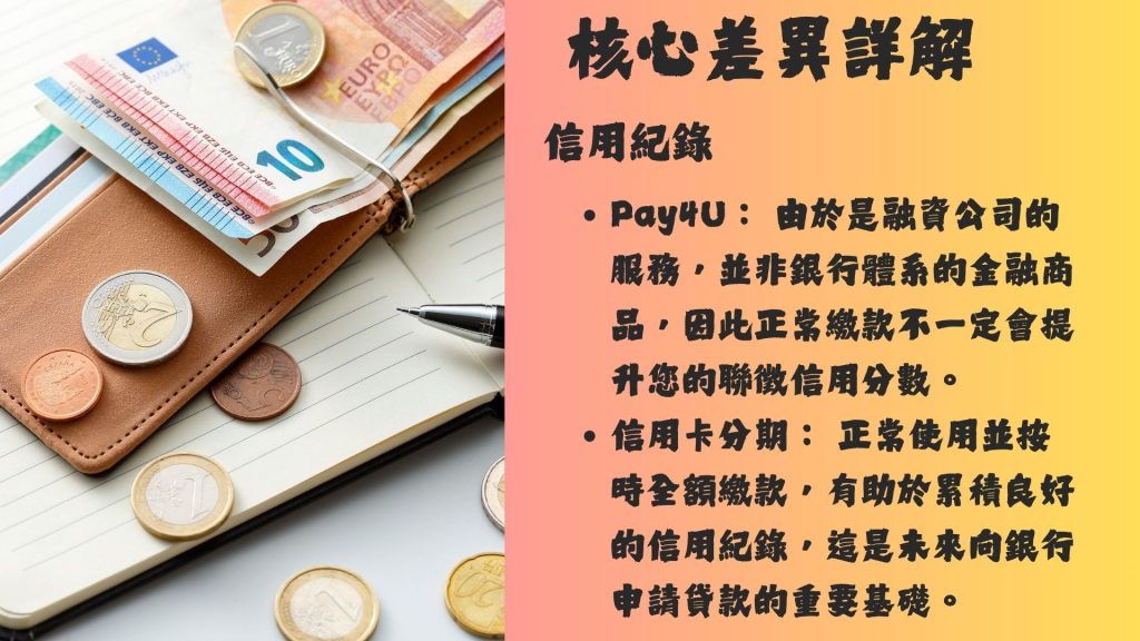 Pay4U 屬於一種**「無卡分期」或「先享後付 (Buy Now, Pay Later, BNPL)」**服務,由融資公司(如和潤企業)提供;而信用卡分期則是由銀行提供。