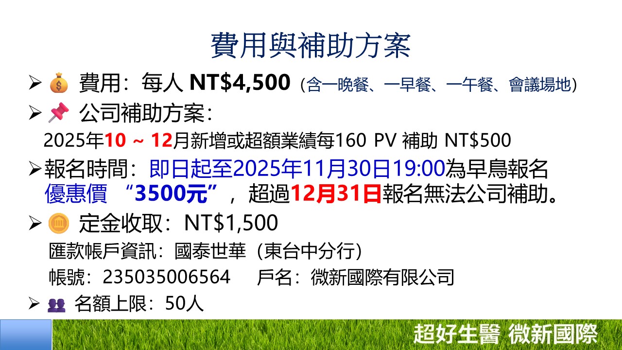 🎯資格:2025/10月/1日~12/25日(新增+超額)每160PV提供NT:500元 補助津貼