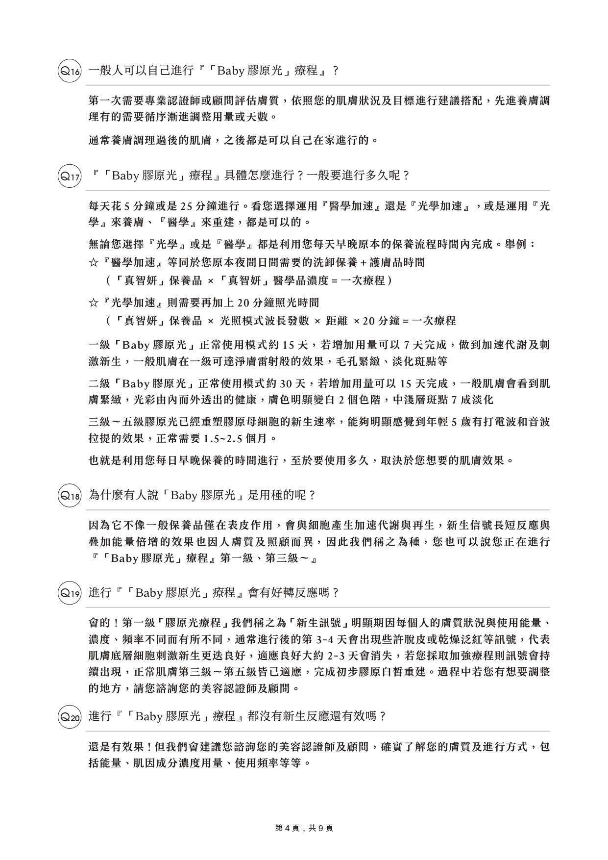 含公司背景、研發理念、系列特色、各個產品品號功效、及醫學品基礎原理、「Baby膠原光」