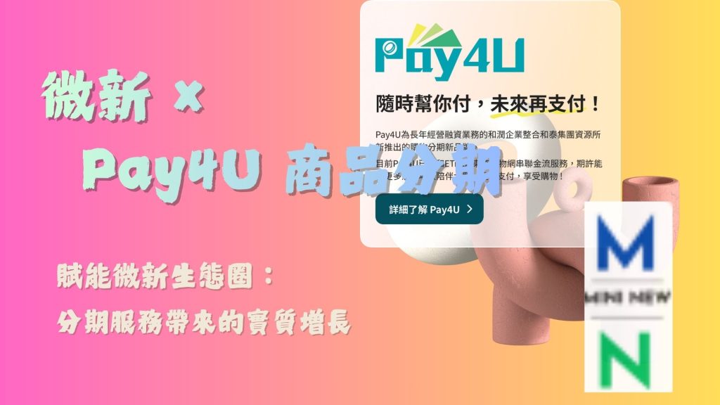微新網路公司深知您的需求,正式宣布與台灣領先的融資服務商 和潤企業(Pay4U) 攜手合作,為您提供最彈性、最便利的無卡分期付款服務!
