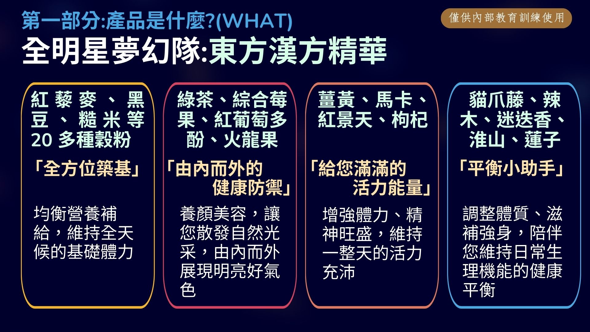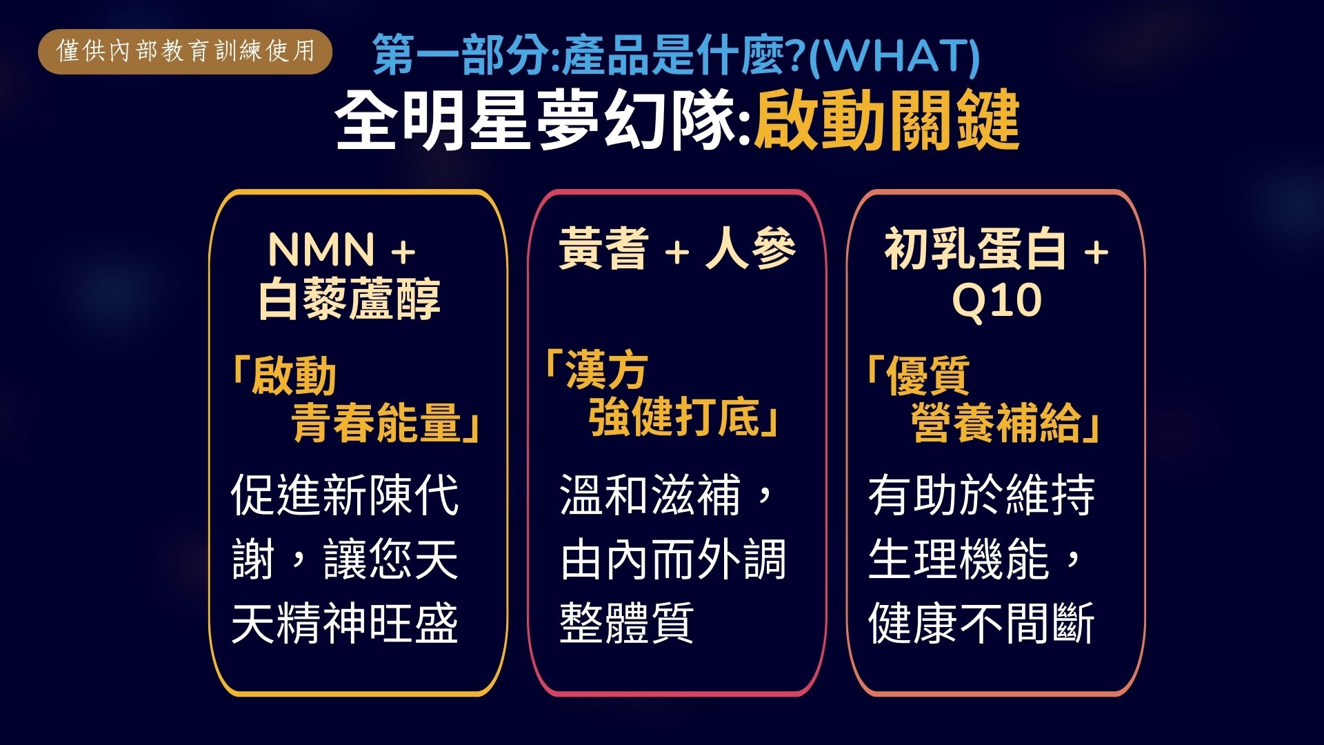 人參、黃耆、黑馬卡。負責提氣補元、賦予細胞動能。